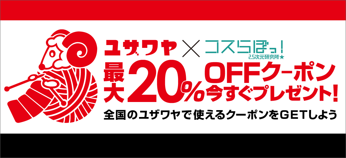 コスらぼっ!アプリをダウンロードすると、なんと!ユザワヤ全店舗で使える「最大20%OFFクーポン」を今すぐGETできます!